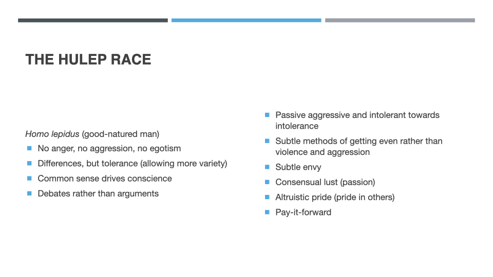 The hulep race is part of a large personal project that involves the relationship between sub-species of humans. I wanted to get opinions from my peers about people that are incapable of anger, which I believe to be a negative, oftentimes time-wasting emotional flaw that has been holding back societal progress.