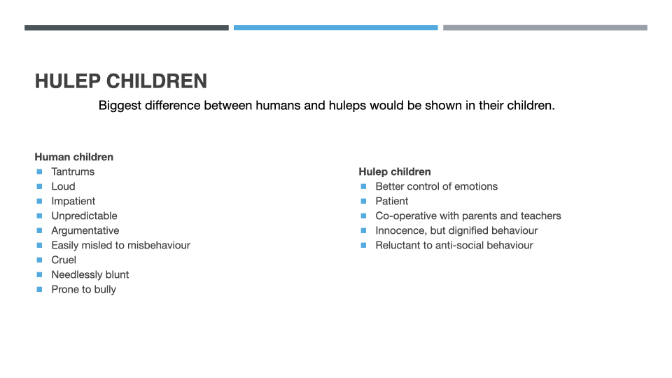 - To provoke the idea of the existence of huleps, a sub-species of humanity devoid of anger, aggression, narcissism, tantrums and many other negative qualities found in humanity