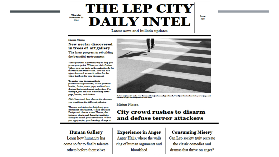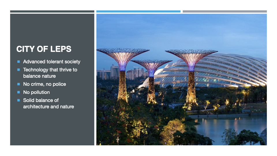 This was an interesting theory project to work on, to get the ball rolling on the idea of a world without aggression and hatred without trying to preach positivity. Perhaps this project could be developed further with a full account of huleps, particularly what makes them different from humans. This account could also theorise how huleps would live in a human world.