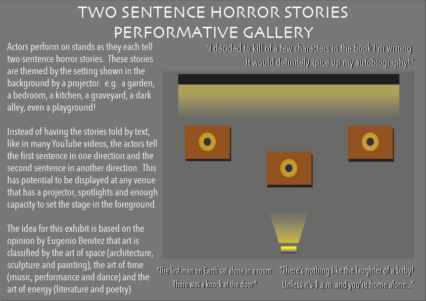 Therefore, I designed a proposal for an exhibit that glorifies this statement. This proposal is for a two-sentence horror story gallery, where actors recite horror stories told in only two sentences in front of a projector screen. This visually supports Benitez’ statement as the actors telling the stories are the art of time, the stories they tell arguably the art of energy, and the projector screen with interchangeable settings are the art of space.