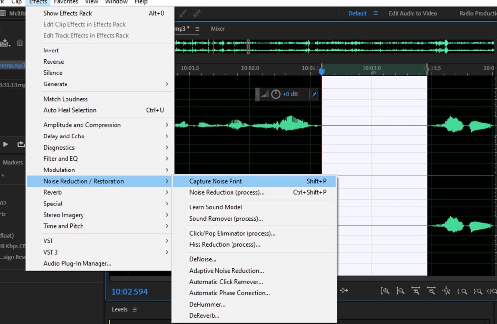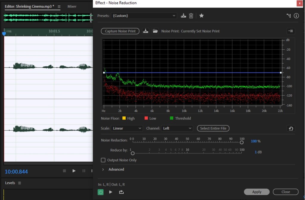 Listening back to the recording of Shrinking Cinema, it was evident that as a host, I had multiple pauses due to nerves. Removing blank spaces and some bloopers made the podcast sound professional, but still natural with flowing conversations. It became necessary to increase sound wave levels of our dialogue, but this allowed more background noise to seep through the wavelengths. So, a sample of “silence” or white noise was selected as a Noise Point and the noise levels throughout the recording were reduced.