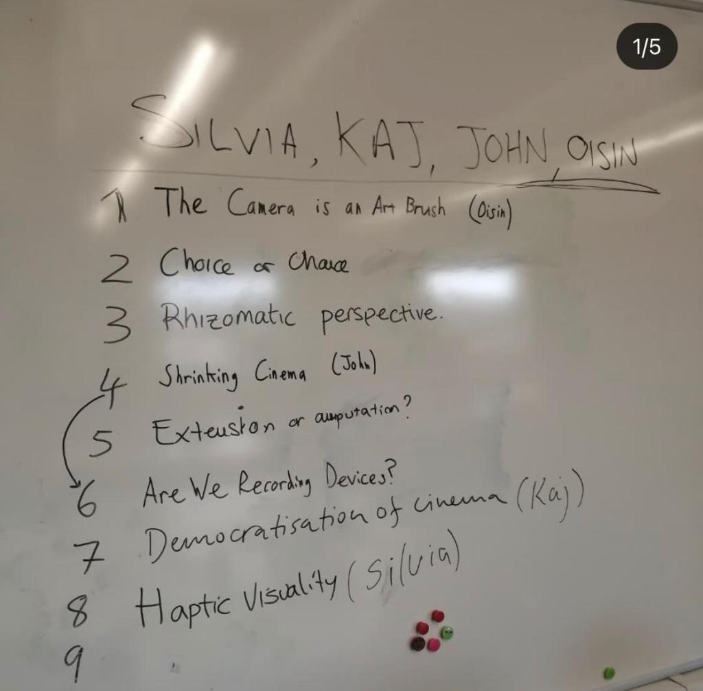 A team of Motion Graphic students at Edinburgh Napier University came together to create their own podcasts and their research points. They brought potential titles for their own podcasts based on their understandings of the text. Shrinking Cinema was one of the titles that was brought to the board, as well as Are We Recording Devices? This became a short section of the podcast as it offered a philosophical topic to debate.