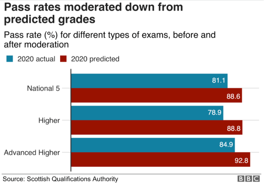 In August 2020, thousands of Scottish school pupils received worse results than expected after the exam body of Scotland lowered approximately 125,000 grades. As final exams were historically cancelled due to the Covid-19 pandemic, these results were estimated by teachers based on the performance of their pupils over the course of the year.