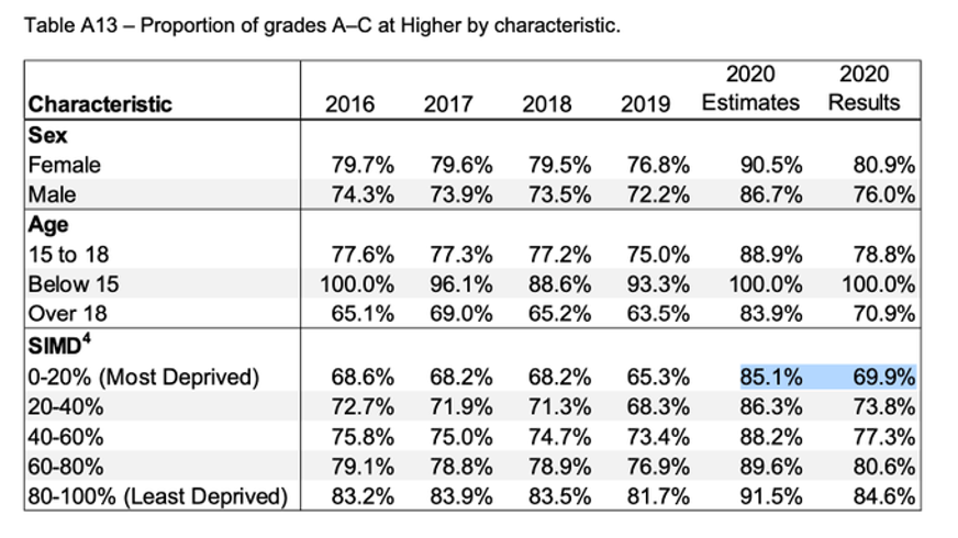 The SQA has also been criticised as the pass rate from many pupils with poorer backgrounds were reduced more than twice than those from richer backgrounds after intervention from the exam board. The pass rate of pupils from poorer backgrounds were reduced from teachers estimates by 15.2%, whereas the pass rates of pupils from richer backgrounds only dropped 6.9%.