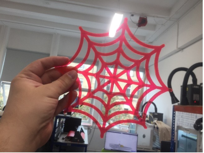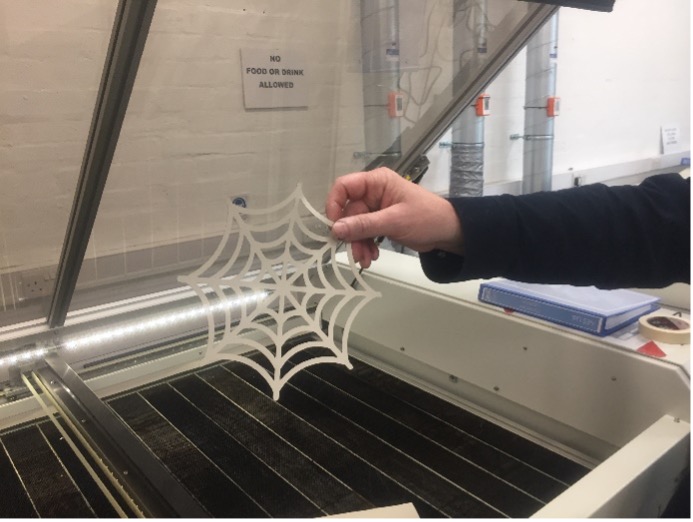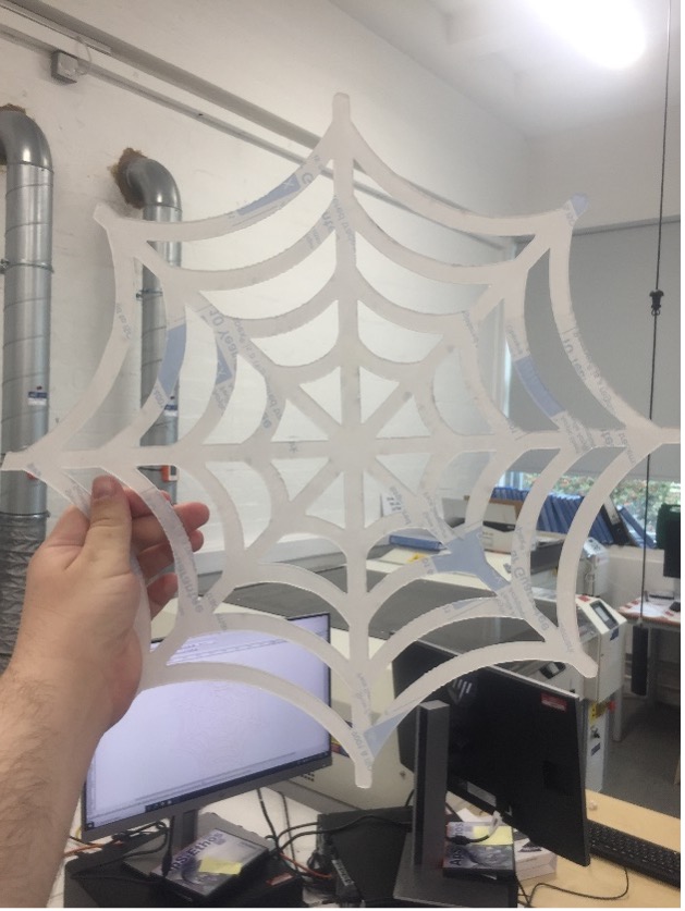 More cobwebs were created with different materials that were laser-cut into a pattern, using a digital stencil of a full spider web. The first was made of paper and others were made of a special acrylic that would potentially shine a cobweb shadow over natural lighting.