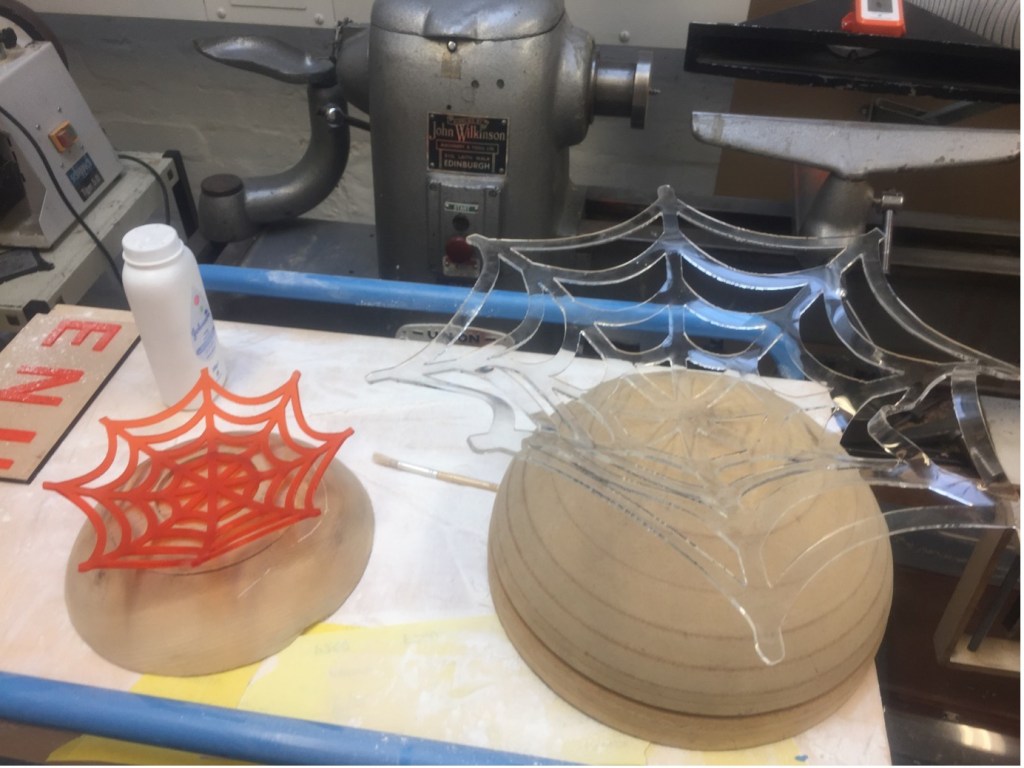Once the acrylic spider webs were created, the idea came about to remodel the to become potential fruit bowl. They were both pressed on a semi-circular surface through a pressure chamber to reshape the webs into a bowl-shape. This was an inspired idea to adapt morphogenic ideas with a flat concept.