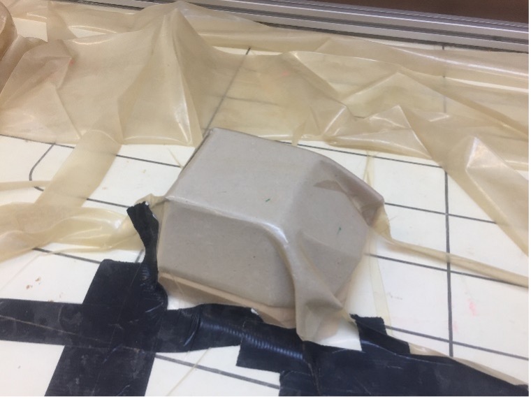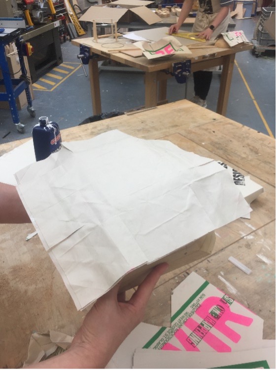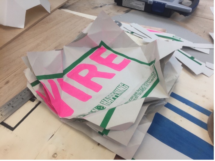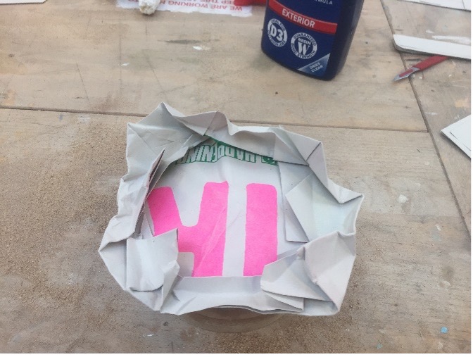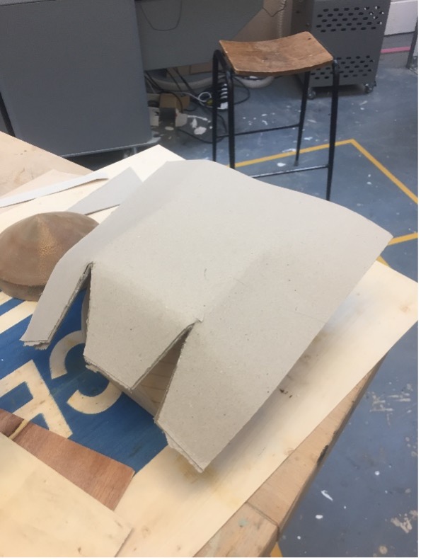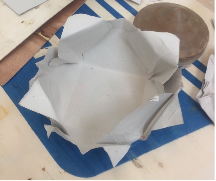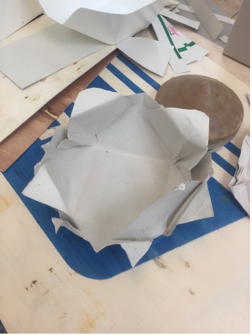 The second production for this module was to produce objects from flat materials. The first object I made was an origami flower. The first flower was roughly and shoddily made, having produced many creases and tears to produce a smaller version of what was intended. However, a larger paper flower was produced with four sheets of plywood layered and glued together and given strength with a vacuum press to hold its shape with the aid of a hard cuboid surface. The small flower was placed inside the new flower so as to find some use for the original design.