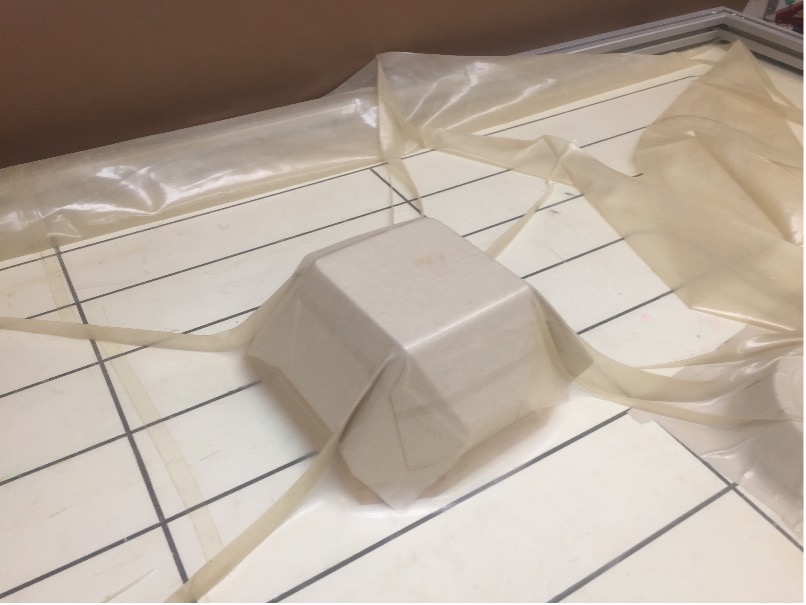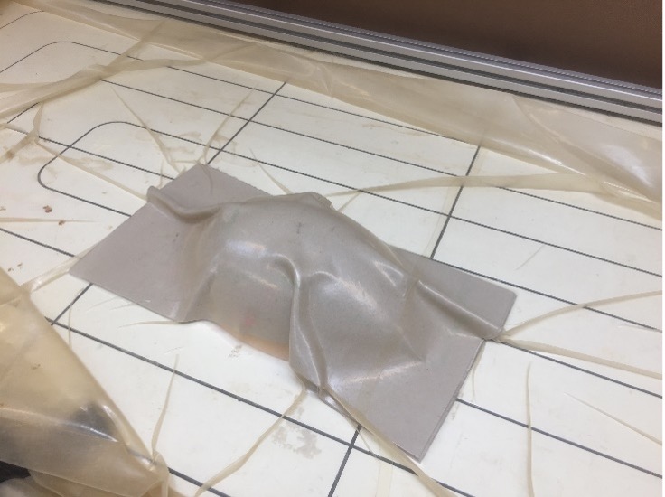 The first flower was roughly and shoddily made, having produced many creases and tears to produce a smaller version of what was intended. However, a larger flower was produced with four sheets of plywood layered and glued together and given strength with a vacuum press to hold its shape with the aid of a hard cuboid surface. The small flower was placed inside the new flower so as to find some use for the original design.