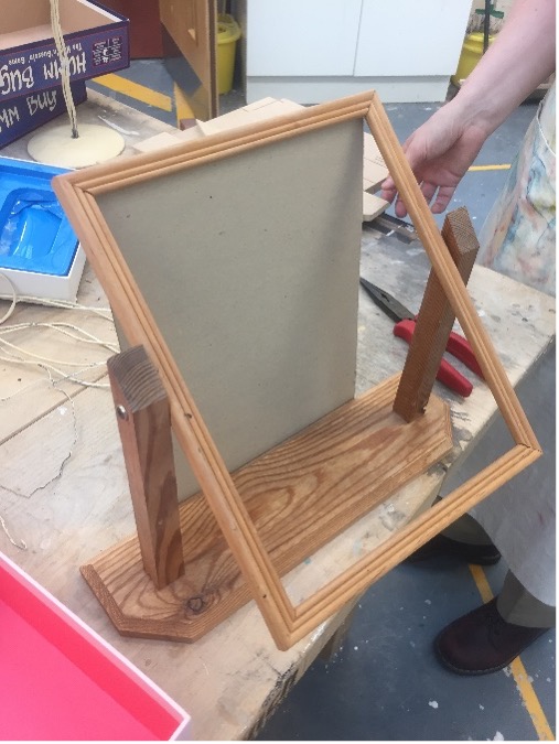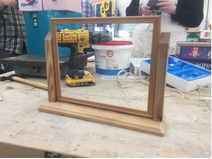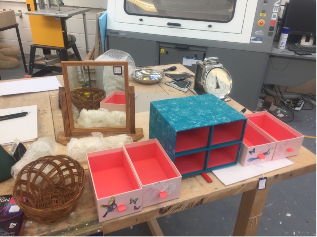 Among the objects purchased from charity shops in Morningside were a framed mirror and a storage box with four small drawers.