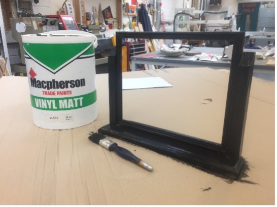 The mirror glass was removed from the frame, which was redesigned from portrait to landscape. Partially unscrewed, the frame became free to swing between the edges. The frame was repainted black, partially to circle back to a Halloween-inspired design.
