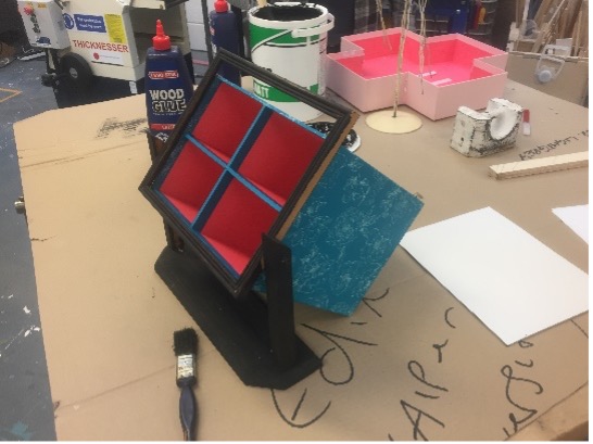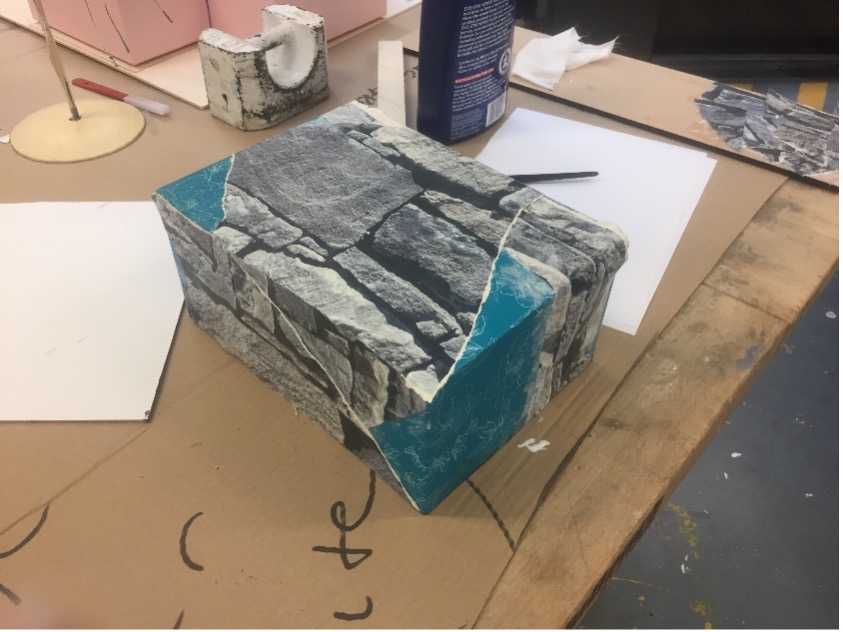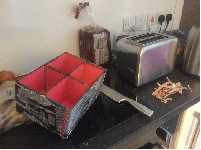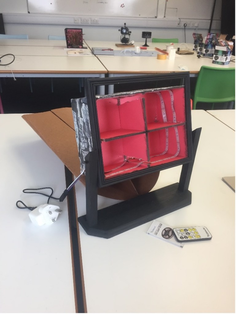 A remote-controlled USB LED strip was purchased from TK Maxx, which meant that the borders of the box (where the drawers originally fit in) had to be partially cut around the main parameter of the box. This meant that the LED strip could be stuck over all four edges of the box. Once tested in the dark, the strength of the light proved slightly weak, presumable with the layers of the LED strip over one another. This emitted a faded shadow that layered over each other.