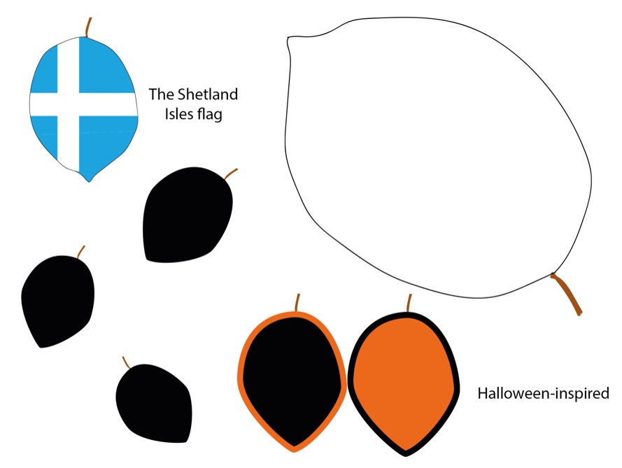 Once a blank leaf template was drawn on Illustrator, it was used to design leaves within the template. Many of the leaves are black as it is John’s favourite colour, but some leaves show different coloured edges. i.e., black and red, black and blue, black and yellow, black and green, etc. This is to highlight John’s sense of style and colour coordination in his wardrobe. Another set of leaves show the flags of all the foreign countries that John had travelled (so far) in his life, even the flag of the Shetland Isles, where he was brought up.