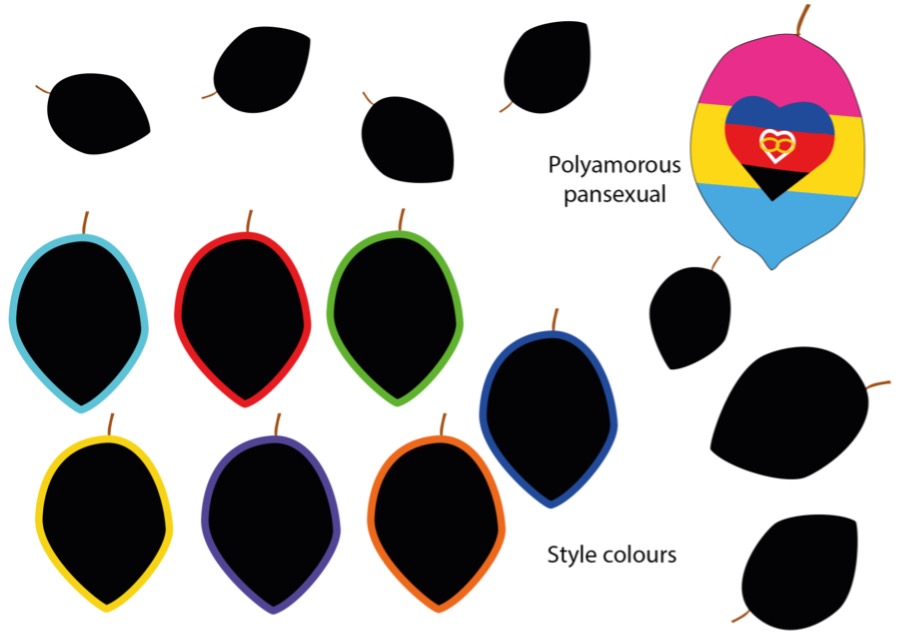 6: Vines grow from bottom-left of screen; leaves produce from the vines; leaves show colours and patterns of lifestyle (polyamorous pansexual and Halloween-theme design)
