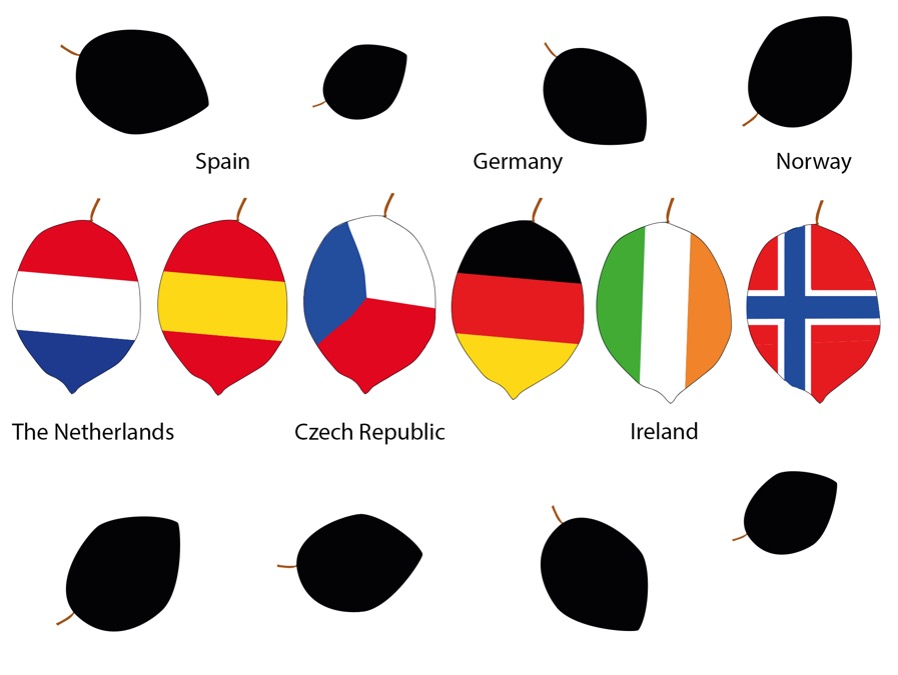Rather than inflict any design copyright issues from stock images online, it became desirable to produce the flags from scratch on Illustrator. It took time to fit the necessary shapes into the leaf outline. Once the Eraser tool removed parts of the shapes outside of the outline, the red vertexes were manipulated to match the edges of the leaf.