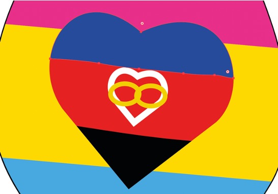 For the polyamorous pansexual flag, two heart shapes were needed. So, three square shapes were made in blue, red and black and the edges were reshaped with the Pen Tool. The three hearts were cut with the Erase Tool to construct one heart. But before that, one of the hearts was copied and made smaller with a white edge.